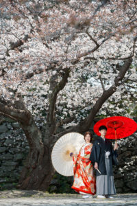 福岡市中央区に位置する舞鶴公園は、桜の名所として知られ、ソメイヨシノやヤマザクラなど多彩な桜が咲き誇ります。背景に城跡や石垣が映えることで、和装・洋装どちらにも映えるロケーションです。